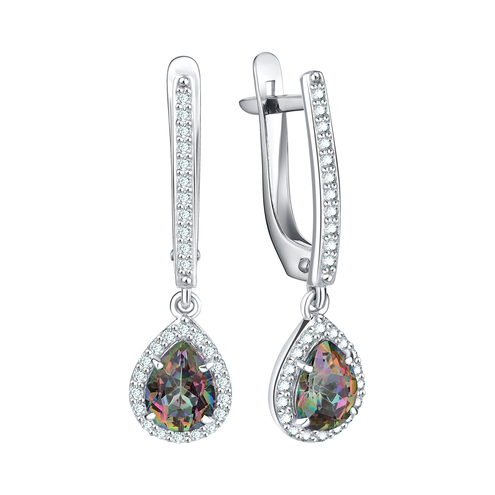 Серьги серебряные с кварцем и фианитами, английский замок. Изделие выполнено из серебра 925 пробы с родированием. Ювелирные серьги - идеальный подарок любимой девушке. Аксессуар подойдет для повседневного образа, романтичного свидания и торжественного мероприятия. Кварц-мистик обладает уникальными переливами, разноцветным блеском и эффектом ирризации (оптический эффект радужного сияния). Благодаря переходам цветов от фиолетового до зеленого серьги будут притягивать восхищенные взгляды.