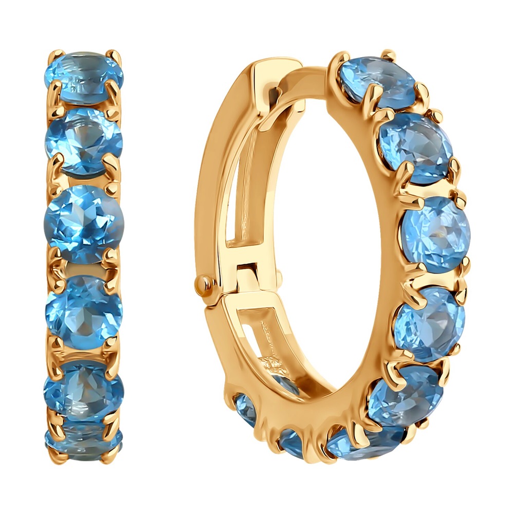 Серьги конго с дорожками из натуральных голубых топазов выполнены из красного золота 585 пробы. Привлекательные серьги с изумительным блеском прекрасных топазов аккуратно и стильно смотрятся, и станут великолепным завершением современных образов владелицы. Приобретайте актуальные серьги для своей коллекции или в подарок, выгодно в магазинах Мир Золота.