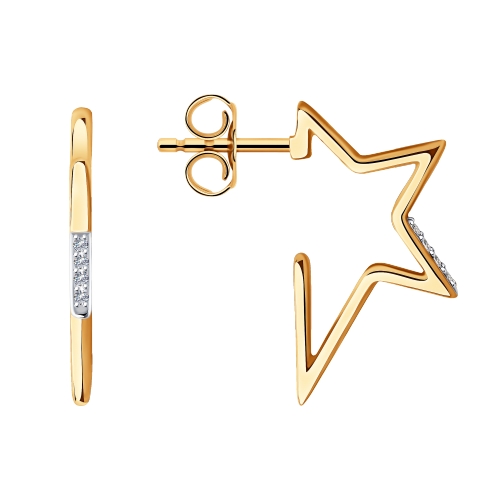 Стильные серьги-пусеты современного дизайна выполнены из красного золота 585 пробы и украшены искусственными бриллиантами. Оригинальные серьги, повторяющие очертания звезд, украшены миниатюрными дорожками искусственных камней. Пусеты отлично подчеркнут вашу индивидуальность и уникальность образа, и привлекут внимание окружающих. Покупайте оригинальные пусеты по выгодным ценам в магазинах Мир Золота.