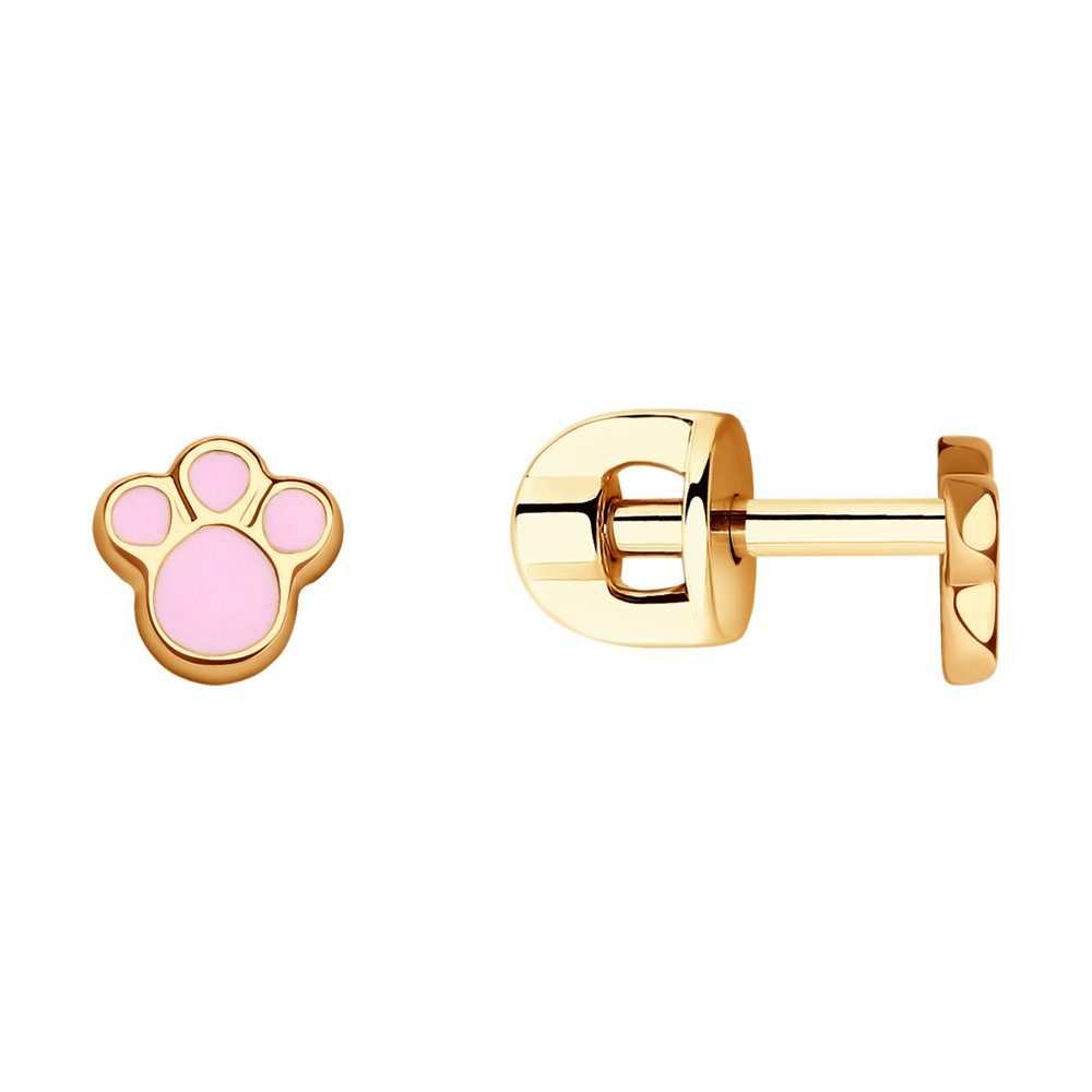 Милые детские серьги пусеты выполнены в виде маленьких лапок из красного золота 585 пробы, украшенные розовой эмалью. Нежные сережки симпатичного дизайна придутся по вкусу юным модницам, они прекрасно смотрятся на ушке, и подойдут для самых маленьких. Приобретайте чудесное украшение для детей по выгодным ценам в магазинах Мир Золота.