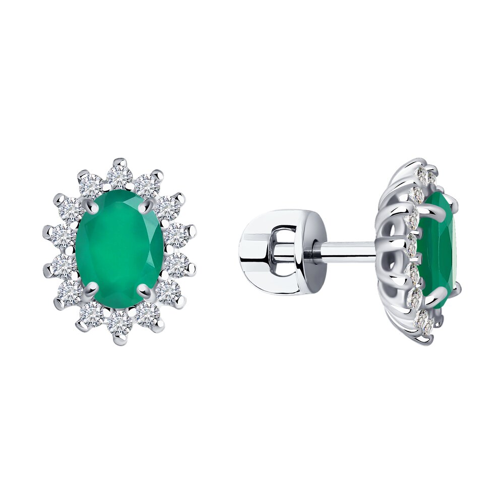 Замечательные серьги пусеты из родированного серебра с агатами и фианитами. Яркие нарядные сережки с зелеными агатами и прозрачными фианитами очень красиво смотрятся, и великолепно дополнят и классический, и вечерний образы. Изумительное украшение с привлекательным блеском камней станет идеальным подарком. Приобретайте ювелирные серьги по выгодным ценам в магазинах Мир Золота.