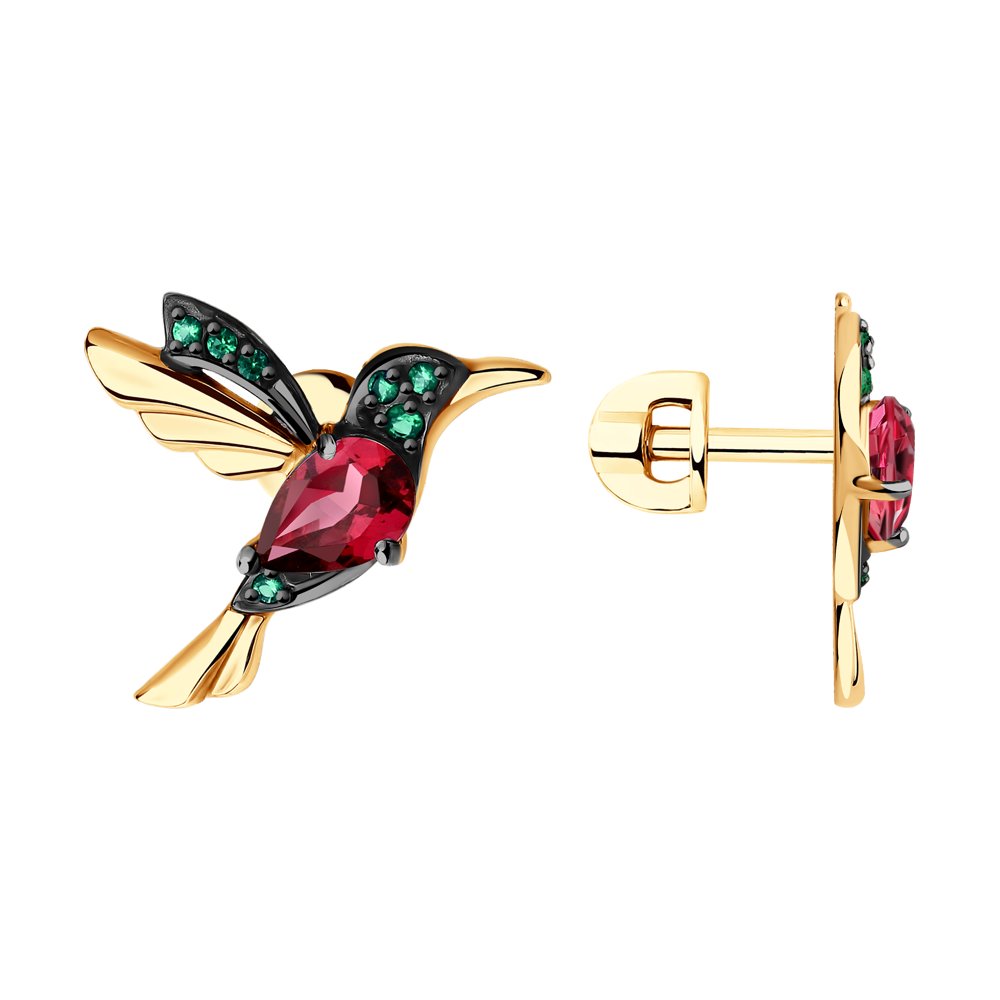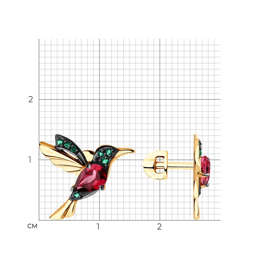 —Серьги пусеты «Колибри» из красного золота с родолитами и фианитами