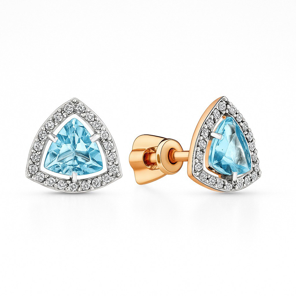 Серьги пусеты с голубыми топазами swiss и кристальными фианитами выполнены из красного золота 585 пробы. Выразительные топазы необычной треугольной формы огранки, подчеркнутые сверкающими фианитами, привлекают своей красотой и ярким удивительным блеском. Современный дизайн отлично дополнит повседневный или вечерний наряд владелицы. Приобретайте пусеты по выгодной цене в магазинах Мир Золота.