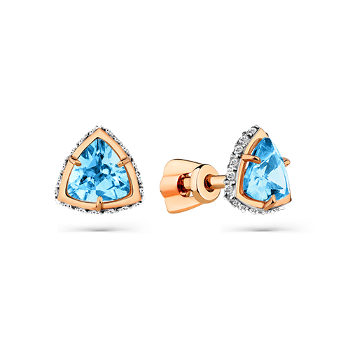 Серьги пусеты привлекательного дизайна с голубыми топазами swiss треугольной формы огранки и дорожками кристальных фианитов выполнены из красного золота 585 пробы. Эффектное украшение с ярким акцентом прекрасных топазов лазурного оттенка сделает образ владелицы более выразительным и загадочным. Приобретайте пусеты для себя или в подарок по выгодной цене в магазинах Мир золота.