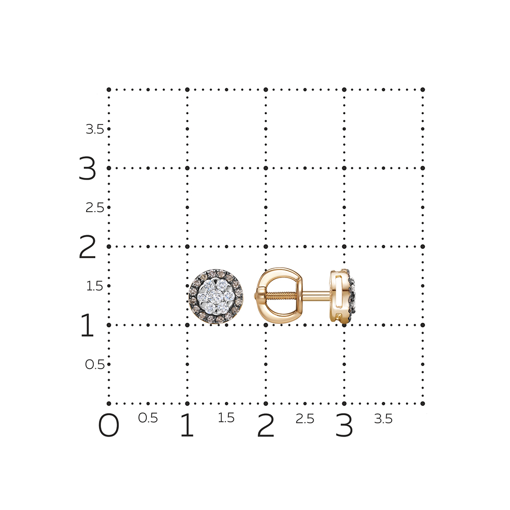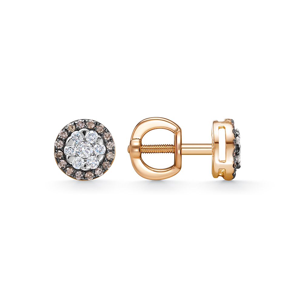 Серьги пусеты классического стиля выполнены из красного золота 585 пробы и декорированы привлекательной композицией из прозрачных и коньячных бриллиантов. Элегантное украшение с завораживающим блеском драгоценных камней очень женственно и благородно смотрится, и станет главным акцентом неповторимого образа. Приобретайте ювелирное украшение в подарок по выгодным ценам в магазинах Мир Золота.