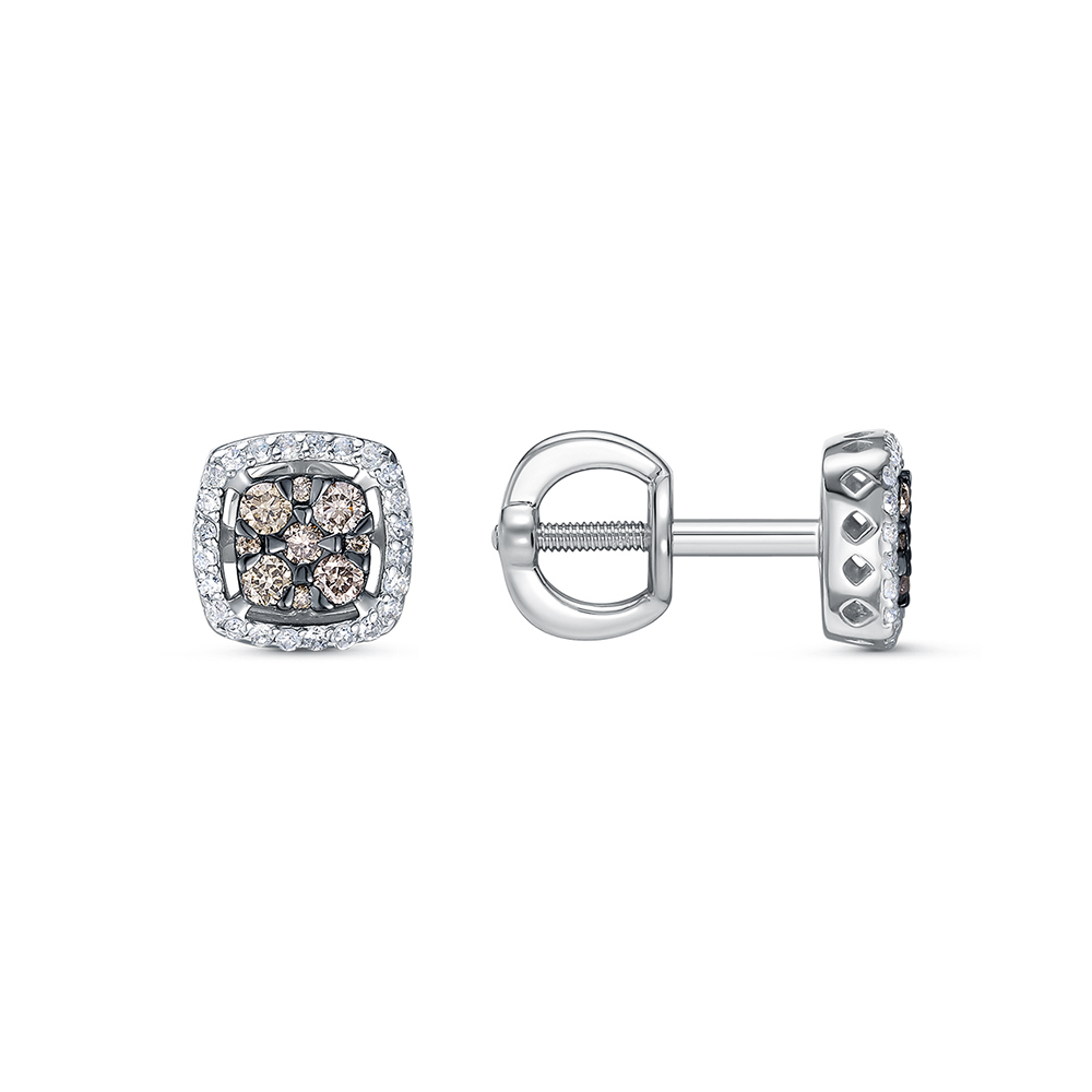 Серьги пусеты из белого золота 585 пробы декорированы привлекательной композицией из коньячных и прозрачных бриллиантов. Невидимая закрепка бриллиантов создает иллюзию более крупных камней и многократно усиливает их блеск. Элегантное украшение с обворожительным сиянием драгоценных камней очень женственно и благородно смотрится, и станет главным акцентом неповторимого образа. Приобретайте пусеты по выгодным ценам в магазинах Мир Золота.
