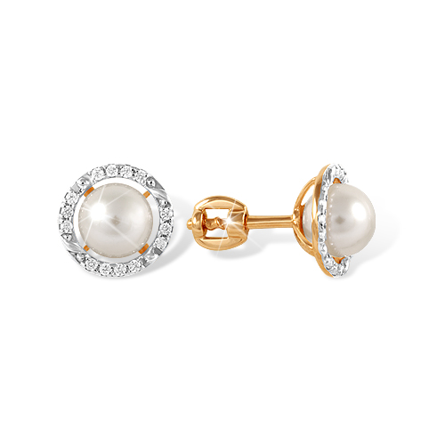 —Серьги пусеты из красного золота с жемчугом и фианитами