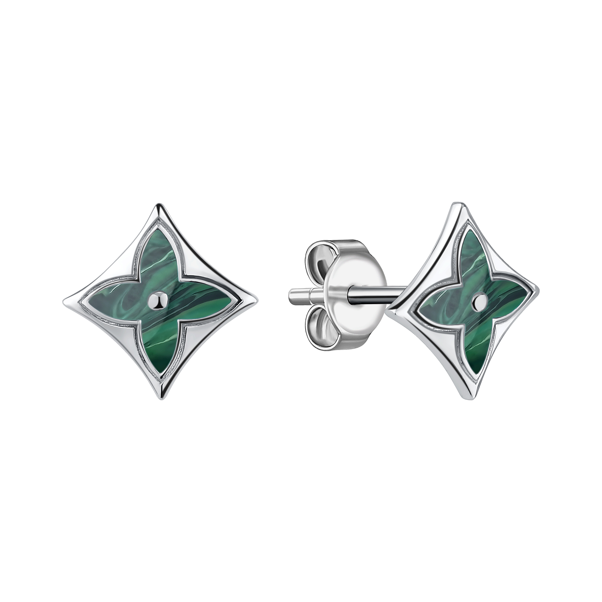 Женские серьги пусеты в стиле знаменитого бренда привлекают внимание уникальным дизайном и качественной отделкой. Центральным украшением служит декоративный элемент в виде элегантного цветка из эмали, имитирующей переливы натурального малахита. Приобретайте пусеты для себя или в подарок по самой выгодной цене в ювелирных магазинах Мир Золота.