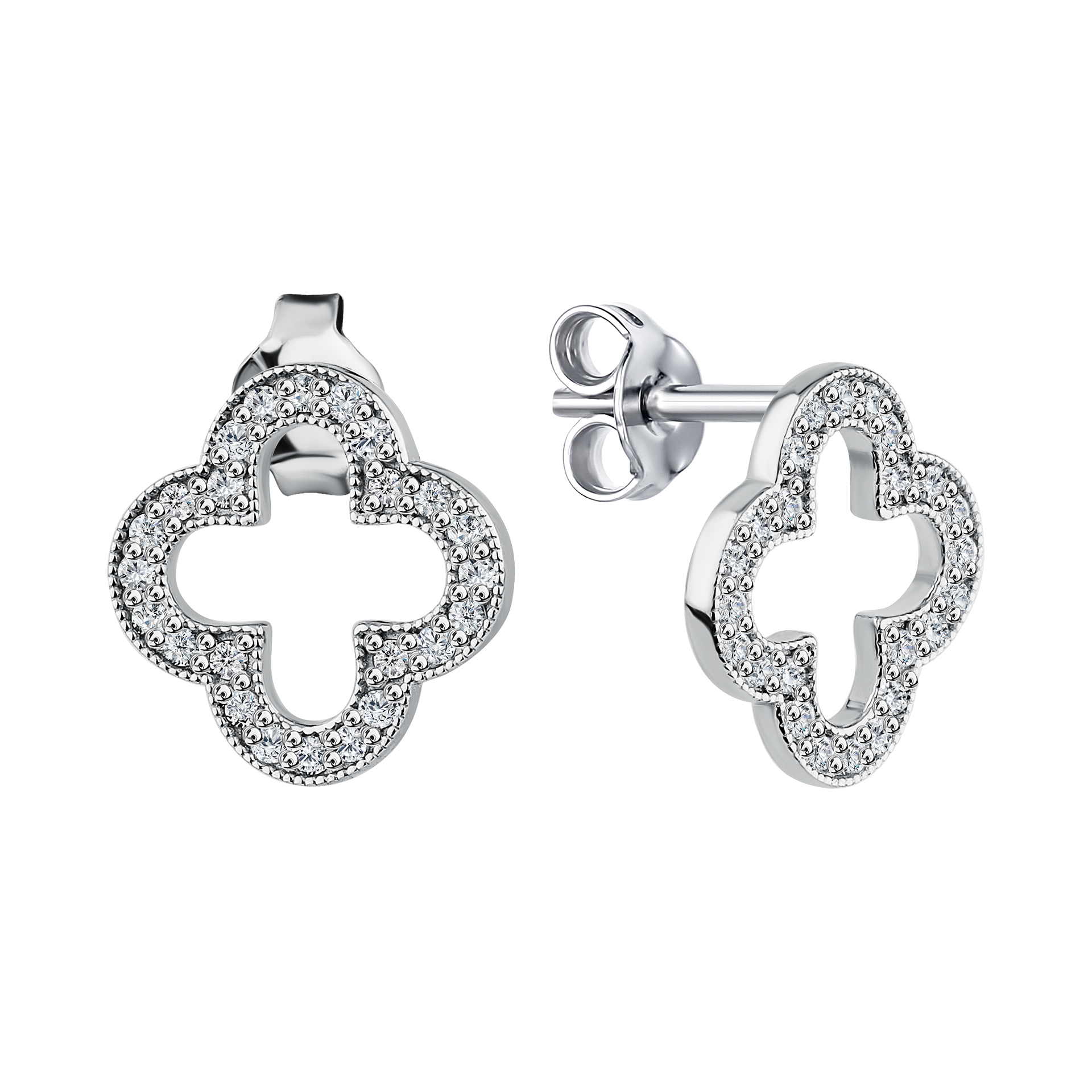 Сияющие пусеты из серебра с фианитами в стиле Van Cleef & Arpels — изысканное украшение из серебра 925 пробы с родированием, которое обеспечивает дополнительный блеск и долговечность. В центре композиции — мотив клевера, символ удачи и благополучия, украшенный сверкающими фианитами. Прозрачные фианиты придают особый шарм и делают серьги универсальными для любого образа.