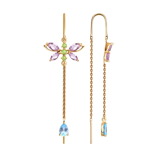 Изящные серьги-продёвки, декорированные миксом полудрагоценных камней, выполнены из красного золота 585 пробы. Очаровательные серьги украшены декоративными бабочками с нежным сиянием аметистов, топазов и хризолитов. Утонченное украшение идеально дополнит романтичный легкий образ. Приобретайте ювелирные серьги для прекрасного подарка по выгодным ценам в Мир Золота.