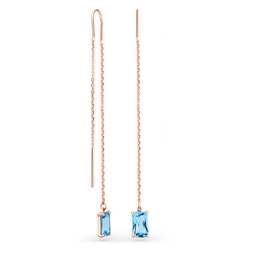 Серьги-продёвки из красного золота 585 пробы с натуральными голубыми топазами swiss элегантной формы огранки подчеркнут женственность и очарование владелицы. Утонченные серьги-цепочки с изумительным сиянием лазурных топазов - универсальная модель, будет удачным выбором как для повседневного ношения, так и для праздничного образа. Приобретайте серьги в подарок выгодно в магазинах Мир Золота.