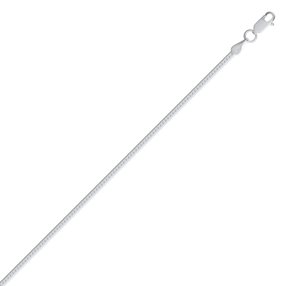 Стильная женственная цепочка с плетением Снейк из родированного серебра 925 пробы. Определенное расположение звеньев цепи создает красивый и уникальный вид плетения; цепочка изящно и аккуратно смотрится, и подойдет под любой стиль и повод. Покрытие родием препятствует потемнению серебра и придает дополнительный яркий блеск украшению. Приобретайте серебряную цепь с красивым плетением по выгодной цене в магазинах Мир Золота.