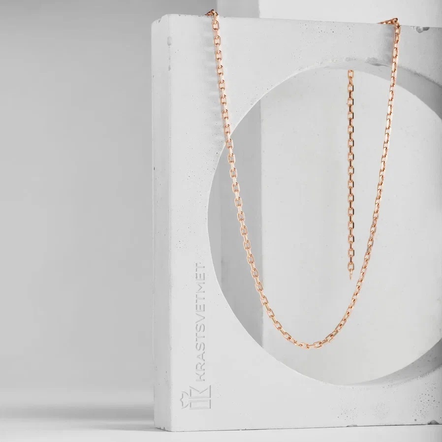 Классическая цепь из благородного красного золота 585 пробы якорного плетения Ролло с удлиненным звеном с алмазной гранью подчеркнет красоту кожи. Золотая цепь в якорном плетении - это настоящая ювелирная классика, которая удачно смотрится как самостоятельное украшение, так и под подвеску. Пустотелая цепь из красного золота представлена брендом Krastsvetmet.