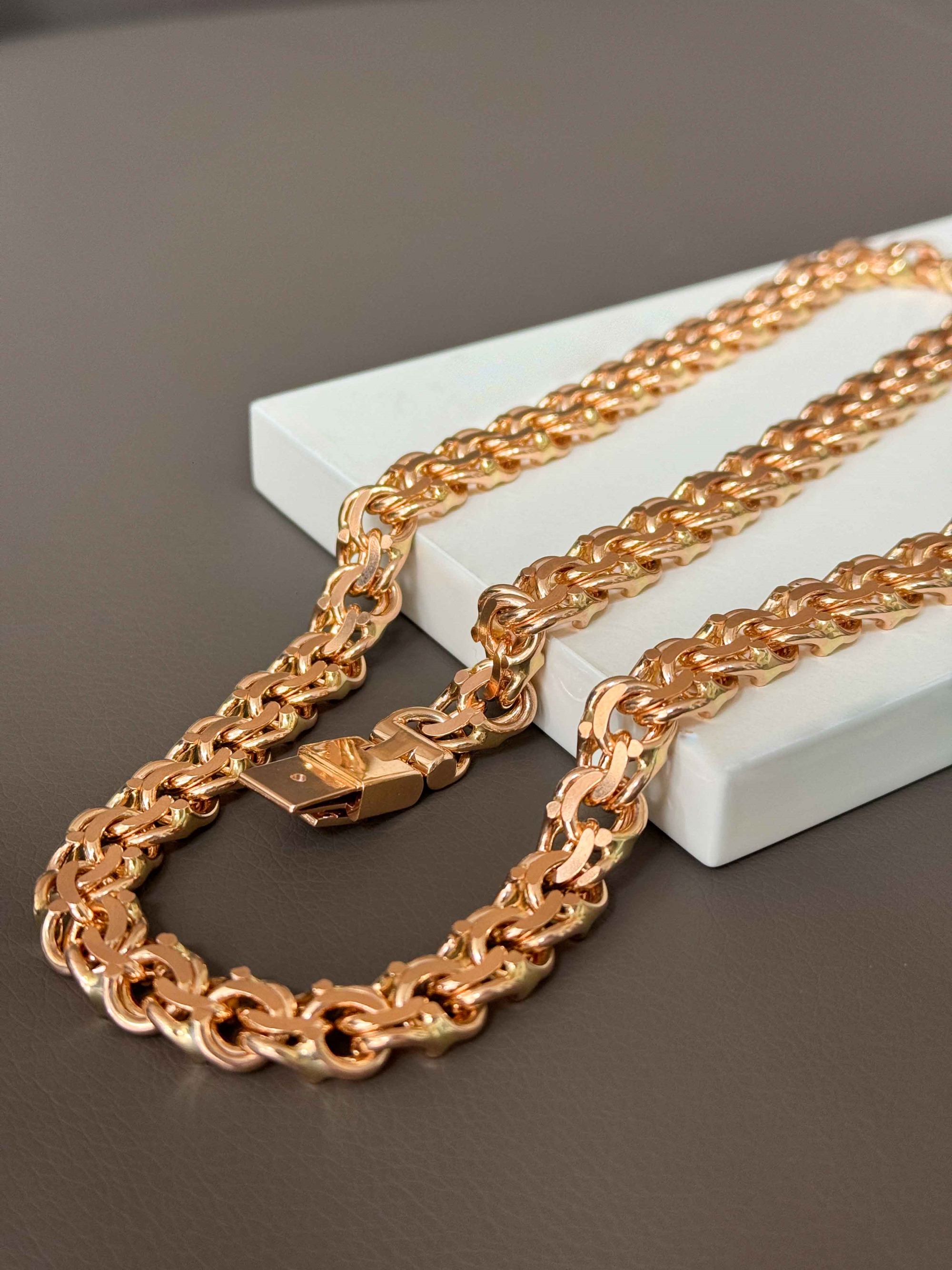 Полновесная мужская цепь плетения «Бисмарк» из красного золота 585 пробы — стильное классическое украшение, подчёркивающее высокий социальный статус своего обладателя. Цепь отличается массивностью и внушительной эстетической привлекательностью благодаря особому способу соединения звеньев, придающих изделию объём и глубину. Прочность и долговечность цепи гарантированы использованием качественного сплава золота 585 пробы, сохраняющего превосходный внешний вид даже при активном ежедневном использовании. Вес цепи 233 грамм, размер - 65 см.