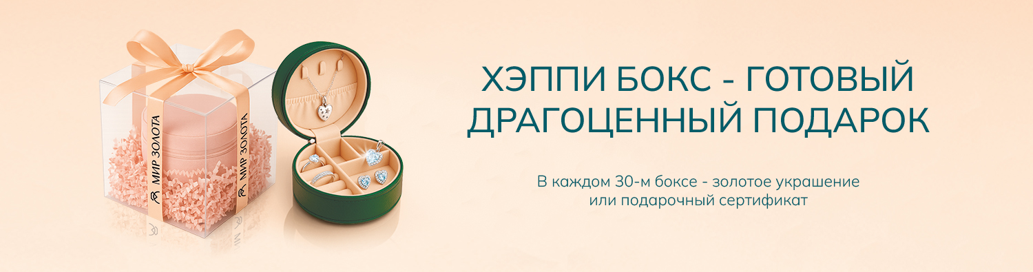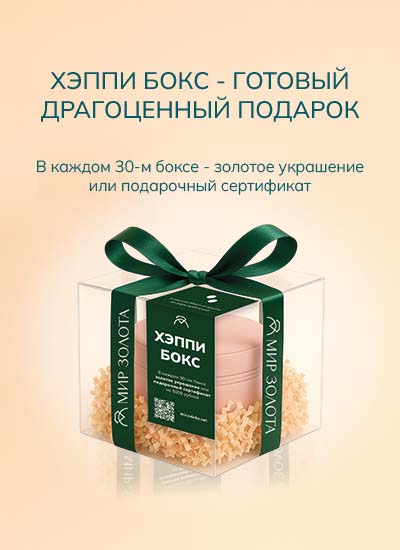 В Хэппи Бокс может оказаться любое ювелирное изделие: оригинальная подвеска, сияющие серьги, роскошный браслет или изысканное кольцо. Но это ещё не всё! В каждом тридцатом боксе вас ждёт дополнительный подарок - золотое украшение или подарочный сертификат в МИР ЗОЛОТА номиналом 5000 рублей!
